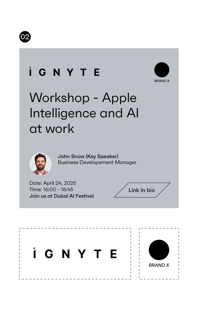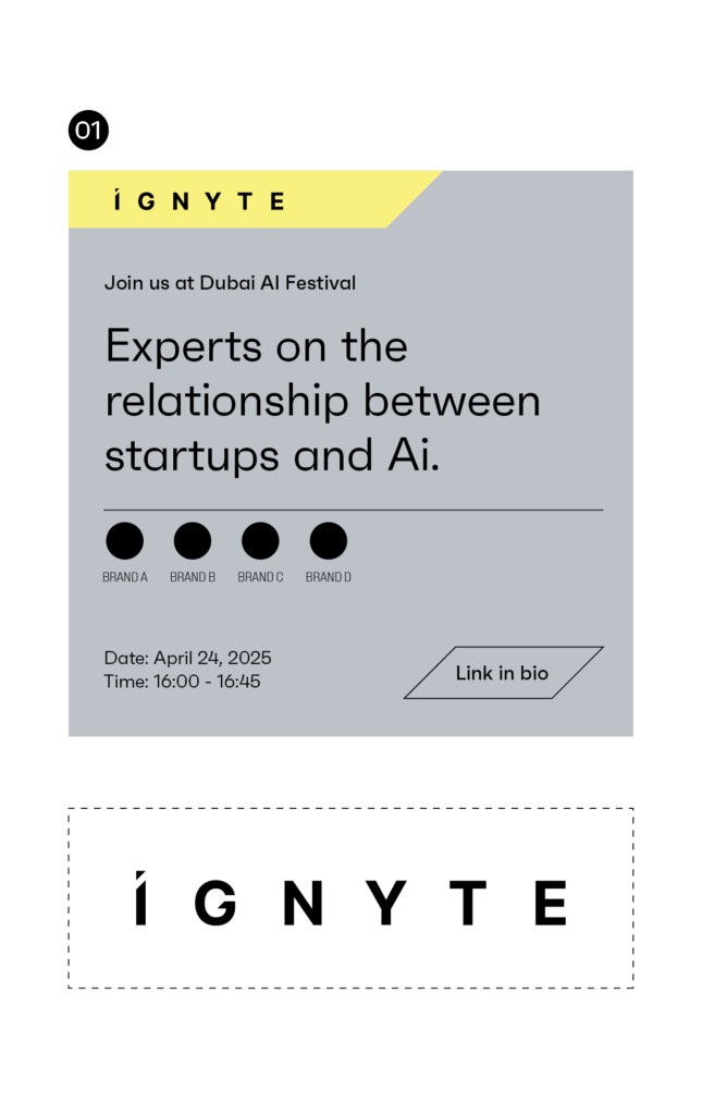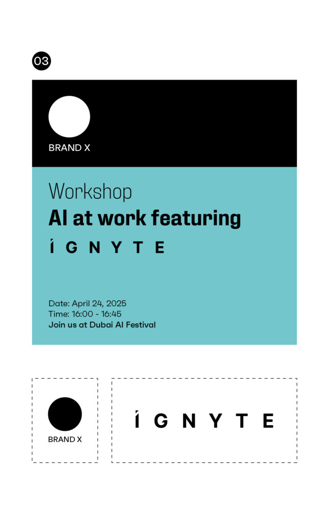 Primary brandmark should be used when the Ignyte brand is featuring external brands. The external brands should play a secondary role in terms of size and hierarchy across comms that feature external brands.