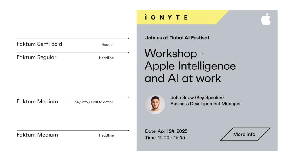 Typography should always be implemented in a clean and structured manner. Particular attention should be given to the weights used for body copy and headlines. The Latin typeface Faktum and the Arabic typeface F37 Bolton Arabic are available in multiple weights, allowing for the building of hierarchy across different types of information – for example in information graphics or illustrating abstract or complex business concepts.