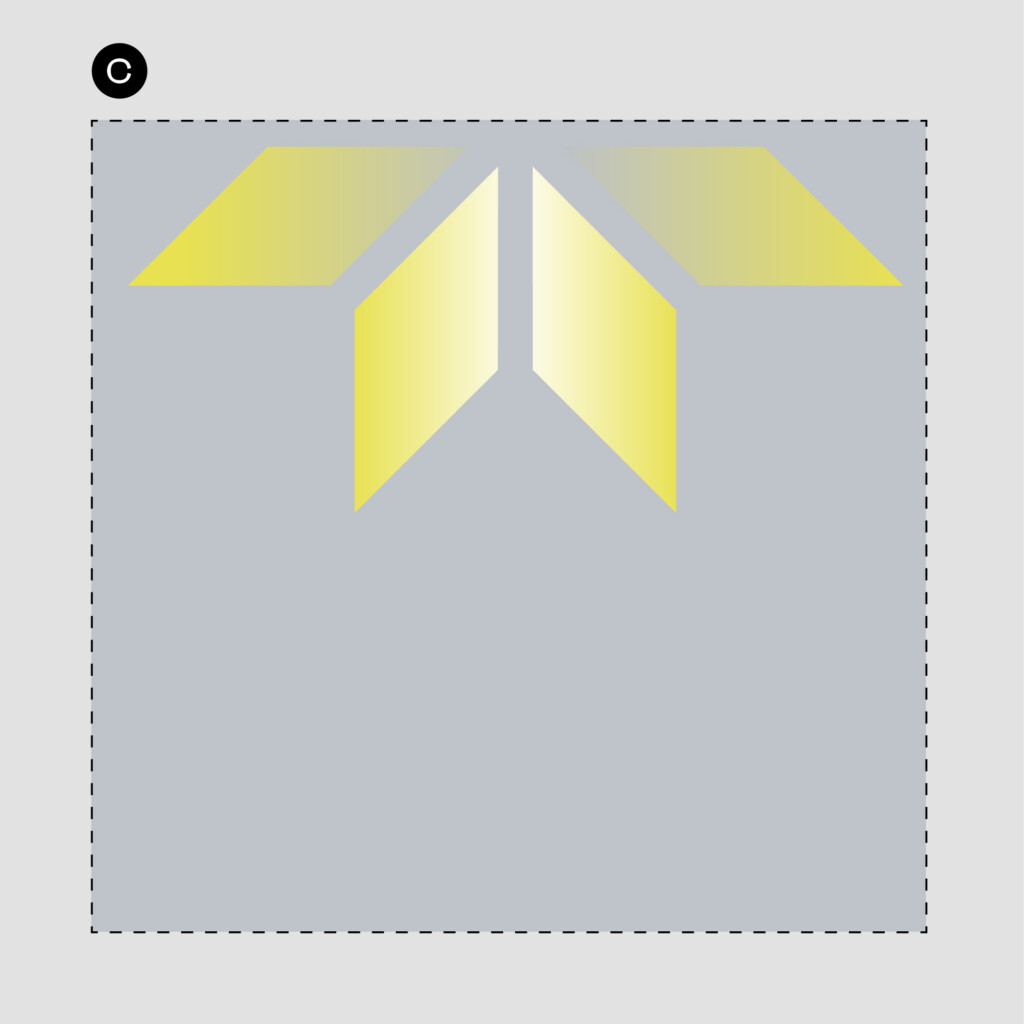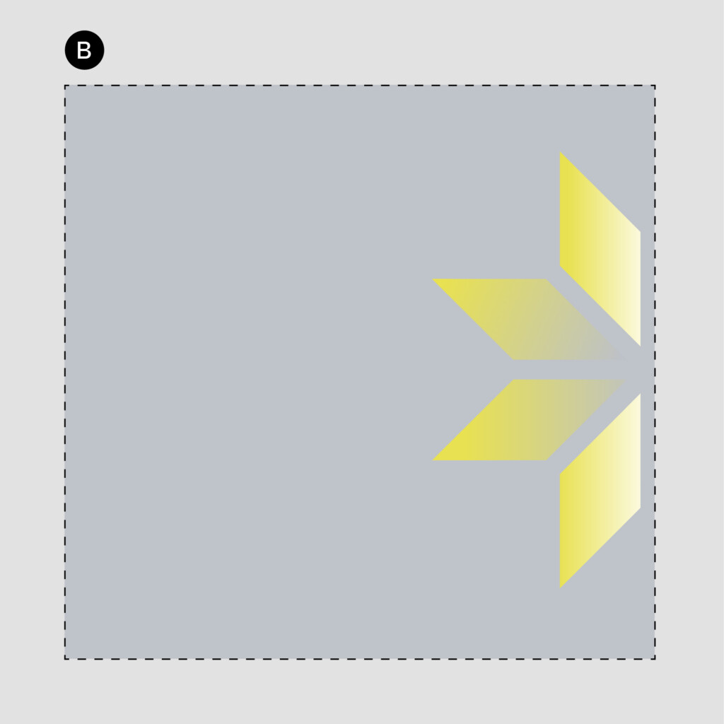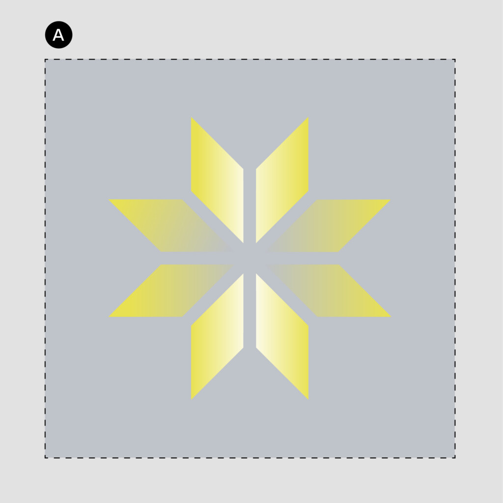 B & C. Crops of the Starlight graphic on any edge of the layout – showing 4 of the star facets – and can be used as a standalone graphic or behind the brandmark, typography or images.